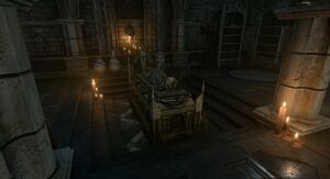 At the foot of the sarcophagus between two columns, a tile is highlighted on a Perception check. If party members stand on it with a combined weight of at least 400 kg (800 lbs), a hidden door opens along the southeastern wall of the mausoleum.