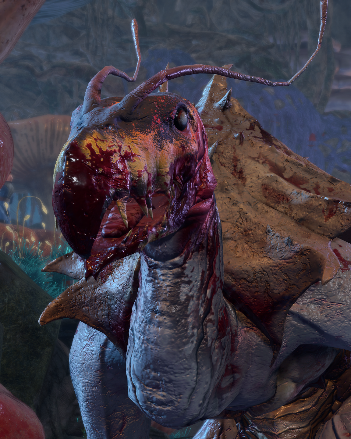 Hook Horror Spore Servants can be encountered in the Ebonlake Grotto of the Underdark region only. It is a dead mostrosity, reanimated by Myconids through their Animating Spores ability. Brought back from the dead, this creature implicitly obeys the myconids' sovereign (the colony leader) and defends the colony inhabitants against any threat.