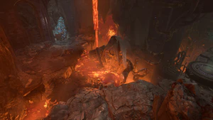 The terrain of the Abandoned Refuge consists of crumbling architecture interspersed with caverns and lava flows, which frequently require jumping, or similar measures, to navigate. In this area, the player may discover two Mithral veins, from which they can extract Mithral Ore. This can be used in the adjoining the Adamantine Forge location.