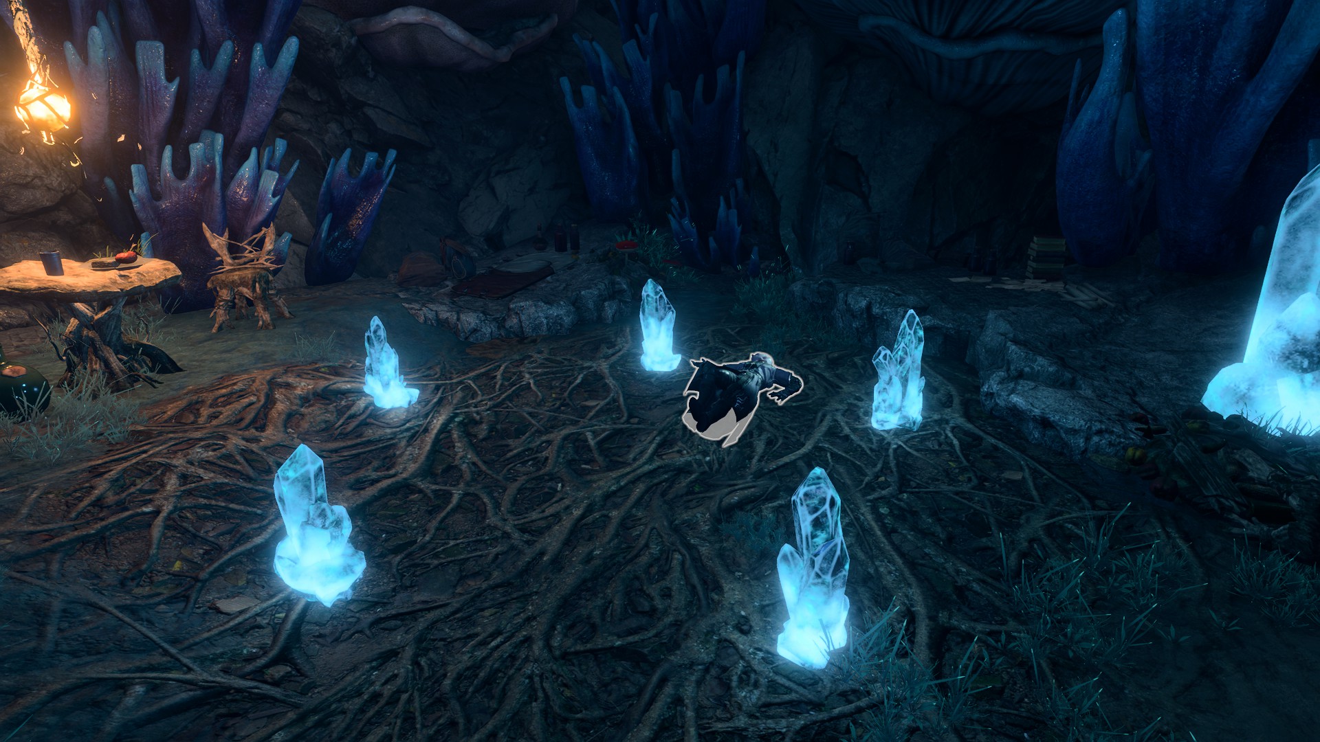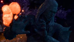 Dhourn is one of many petrified drow west of the Selûnite Outpost. In the outpost is a broken window at X: 141 Y: -240 near the statue of Selûne. The party must walk through it and climb down the knotted roots. If moving west past the droves of petrified drow, a cutscene triggers where a Spectator appears and attacks the party. On its first turn, it unpetrifies the drow, typically starting with Dhourn. Dhourn and any other drow the Spectator unpetrifies are charmed and fight against the party until the Spectator is defeated. They then become neutral.