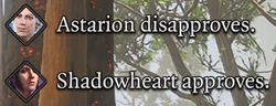 - ↑ Companions who join the party later in the game sometimes have opportunities for large shifts in approval based on the player character's choices. For example, being kind or magnanimous with Thaniel after lifting the Shadow Curse from the land in Act Two results in a gain of 20 approval with Halsin from that conversation event alone.