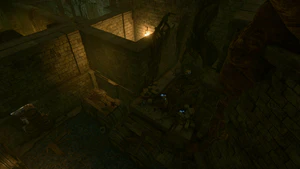 Ethel's lair lies behind the Wooden Wall, which can be lockpicked, but it inflicts Hideous Laughter on the lockpicking character upon succeeding if not resisted. It can also be opened with or without the Mottled Key, which is carried by the Mask Of Terror. Inside this door, a successful DC 15 Perception Check reveals a lever which can be pulled to provide a shortcut when leaving back to the Cellar Door. There is a stack of three alcohol barrels hiding this door from the other side when first entering the basement. Blowing up these barrels opens the secret door allowing to bypass the trapped rooms. By proceeding this way the party can begin the final fight without having to get past her mind controlled victims.