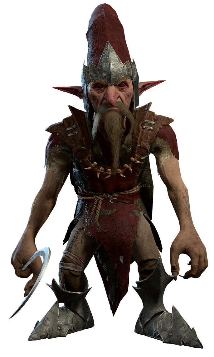 BOOOAL is a Redcap who can be found being worshiped by the Kuo-toa of The Festering Cove in the Underdark as their God of Murder. The kuo-toa worship has enhanced his strength and made BOOOAL much stronger than is normal for a Redcap.