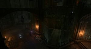 The door on the east side of the throne room leads out to the sanguine laboratory, and the west door leads to the prison antechamber. Behind the throne is a double staircase leading up to the first floor of Moonrise Towers.