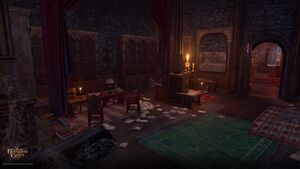 After receiving the key to Balthazar's chambers, the party may search his room freely despite Z'rell's warning. Neither the guards nor the Scrying Eye normally enter it. The room can also be reached by a system of wooden footways and roots clinging to the tower's outside walls, leading up to the balcony behind the necromancer's chambers. There are a few opportunities to gain inspiration for exploring the off-limits parts of the first floor: