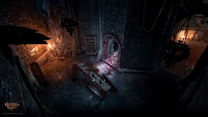 A small antechamber adjacent to the dormitories has a staircase leading down to the Moonrise Towers Prison, with bloody traces on the floor marking the way unmistakably.