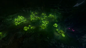 The Dread Hollow occupies western and north-western parts of the Underdark region. The hollow forms a ring-like territory around a chasm, with a very large and brightly shining Sussur Tree growing in the middle[1]. To the north-east, a bunch of Knotted roots leads to a separate grotto overgrown with poisonous Bibberbang mushrooms.