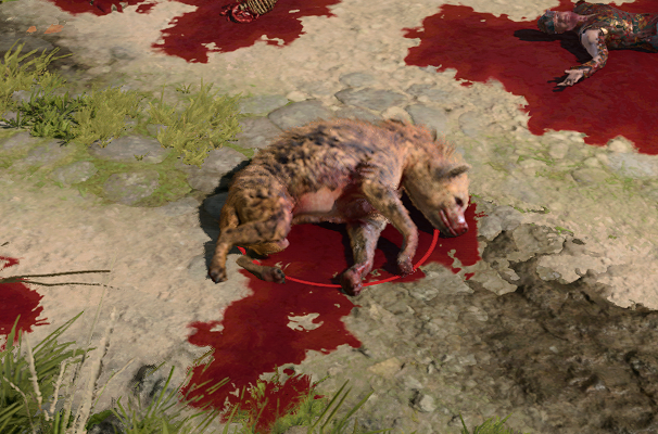 One of the Bloated Hyena can be spoken to by using Speak with Animals, allowing the party to eliminate it before it gives birth by passing a DC 12 Dexterity check.