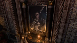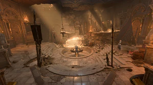 On the left and right sides of the Chamber are narrow corridors. The right contains several displaying showcases with some precious artefacts that the githyanki collected in the monastery after establishing the Crèche. The left one has a displaying case, several decorated barrels, and two statues of Lathander. Both have spinning bases – turning them to the correct position opens the passage to the Secret Chamber of the monastery, where the quest Find the Blood of LathanderFind the Blood of Lathander can be finished.