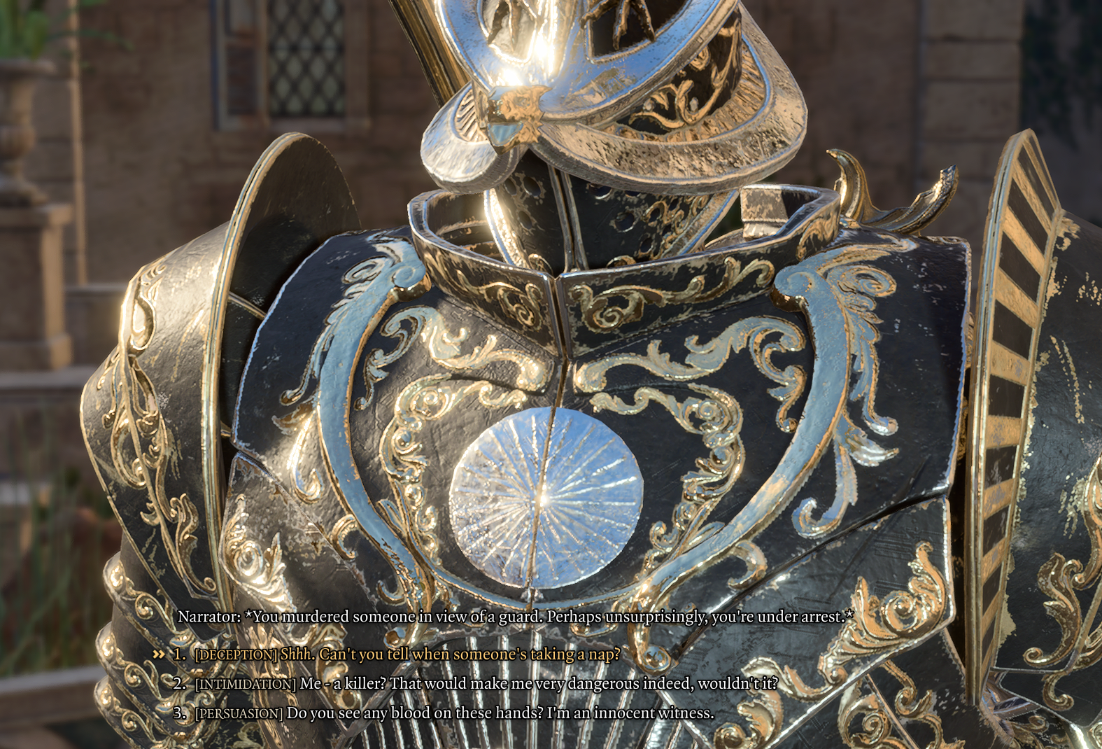 If the culprit is caught by the guards, interrogatory dialogue begins. On some occasions, the criminal can try to rectify the crime by undoing it or bribing the interrogator. If committing crime in a location with a designated jail, the criminal can submit to arrest. Otherwise, the following options are always present: engage in combat, or try to wriggle out of it using a Persuasion, Intimidation, or Deception check. These ability checks generally become more difficult as the magnitude of the crime increases.