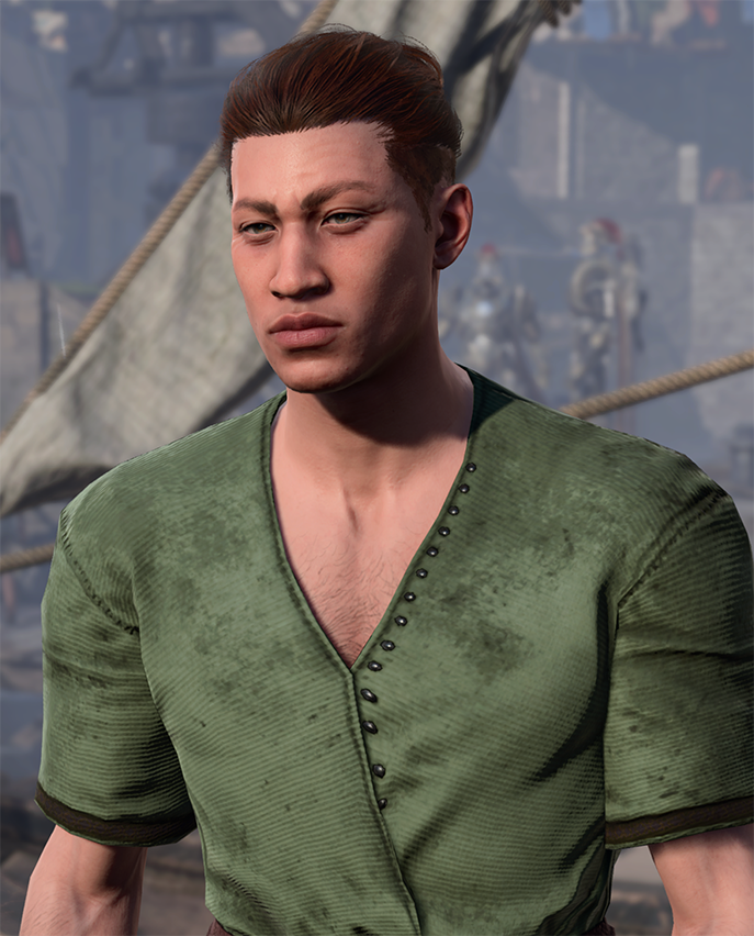 Dharin Brislen is a human civilian trying to smuggle his family out of Baldur's Gate during Act Three.