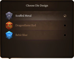 A die design (or "dice skin") is a selectable cosmetic appearance for the twenty-sided dice used in die rolls. The design is seen on the animated dice used for Ability Checks (and sometimes Saving Throws) initiated by player actions, like dialogue choices or lockpicking. The active design can be changed from the Ability Check overlay via a setting in the bottom left corner. The selected skin is for the player, rather than per save or character, but can be changed at any time.