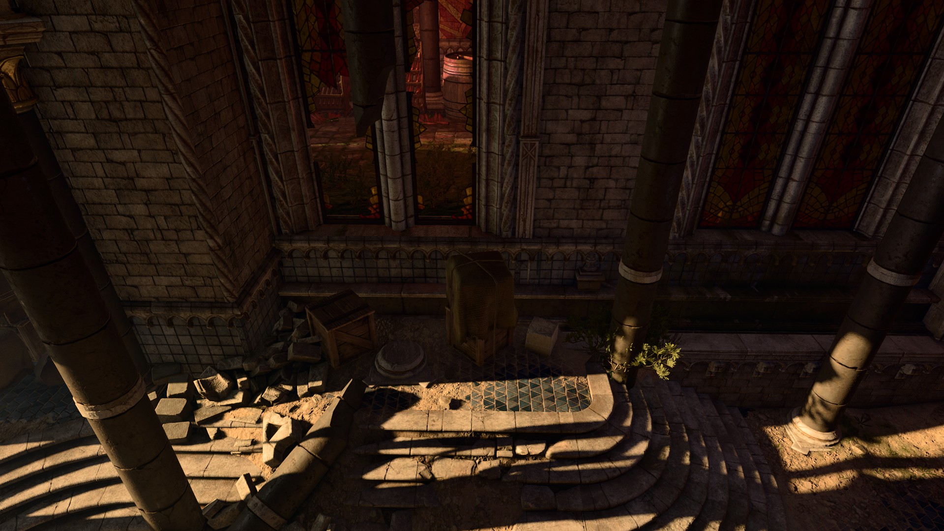 - Proceed West to find a set of crumbling stairs and jump past the gaps to follow the stairs down