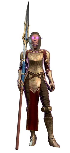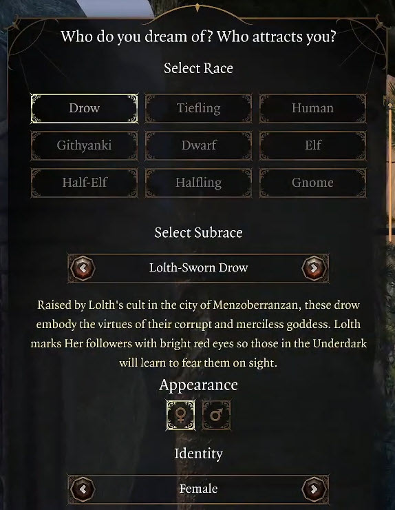 Their appearance is specific to each member of the party, with Karlach describing them as a "golden paladin" and Gale referring to them as female, while the player character sees a version created by the player which can be any gender and playable race except dragonborn. Their default appearance in character creation is a female Lolth-sworn drow.