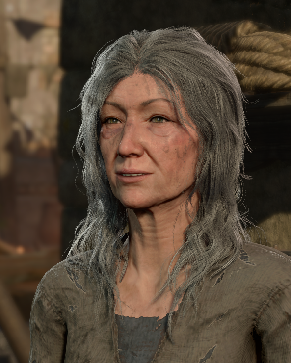 Emmeline Hallowleaf, and her husband Arnell Hallowleaf, raised Shadowheart, originally known as Jenevelle Hallowleaf, in a Selûnite household in the forests outside Baldur's Gate.[1] As a child, Jenevelle undertook a Selûnite coming-of-age ritual in which she was left alone in the woods and trusted to use Selûne's guidance to return to her family. However, the villagers discovered a Sharran spy near the village, and learned that his accomplices sought to abduct Jenevelle. Arnell took on his wolf form to quickly traverse the woods to find Jenevelle, but she had not known about his curse, and panicked at the sight of the wolf, allowing enough time for the Sharrans to find and abduct both of them, as well as Emmeline.