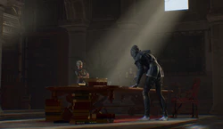 If the player character tried to kill the Emperor in Act One, by choosing the dialogue option "You do a great impression of a human. But you're not fooling me.", the Emperor offers to share memories through a vision. This vision shows Stelmane paralysed in pain, being brainwashed, and turning into the Emperor's puppet. Her face is emotionless, and the Emperor puppeteers her gestures to get a sense of company. Such was its true relationship with Duke Stelmane.[11]