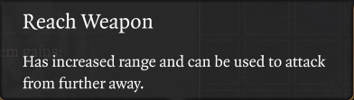 Extra Reach is a weapon attribute that allows weapons to have a wider range than other melee weapons. Characters with Reach Weapons can attack enemies and make an Attack of Opportunity from farther away.