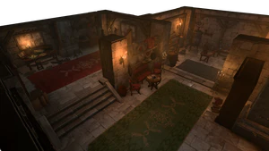 Following the stairs up from the side room next to the entrance leads to a locked door, opened with a DC 20 Sleight of Hand Check. Through the door are the living room and the bedroom. Both have several containers with mostly miscellaneous loot: