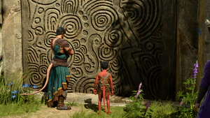 Rikka wanders the nearby oxen area in search of Doni at X: 215 Y: 555. Doni can be found by the Sacred Pool in front of the door to the Inner Sanctum at X: 225 Y: 526. The druids have locked themselves inside while Doni is outside grunting. The party can encourage Doni to return to the hatch by telling him, Go rejoin the others, kid. Doni will run toward the hatch, where Rikka soon finds him. After Doni is found, the party must hurry back to Rikka to resolve the quest, who is grateful that Doni is safe.