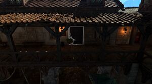 Fraygo's Flophouse (X:-6, Y:72) is across the way from Sharess' Caress. After going up the stairs of the Flophouse, a ladder (X:-12, Y:87) can be taken up to the top floor. On this floor, a red wardrobe can be found (X:-17, Y:82).