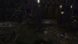 After climbing to the top of the stairs and continuing to move east, there are some rocks that can be jumped across to move forward at X: -562 Y: 427. The door to Philomeen's hiding spot can be lockpicked (DC 10 Sleight of Hand Check DC 10 Sleight of Hand Check), or the party can move along the western wall to find a large gap in the structure.