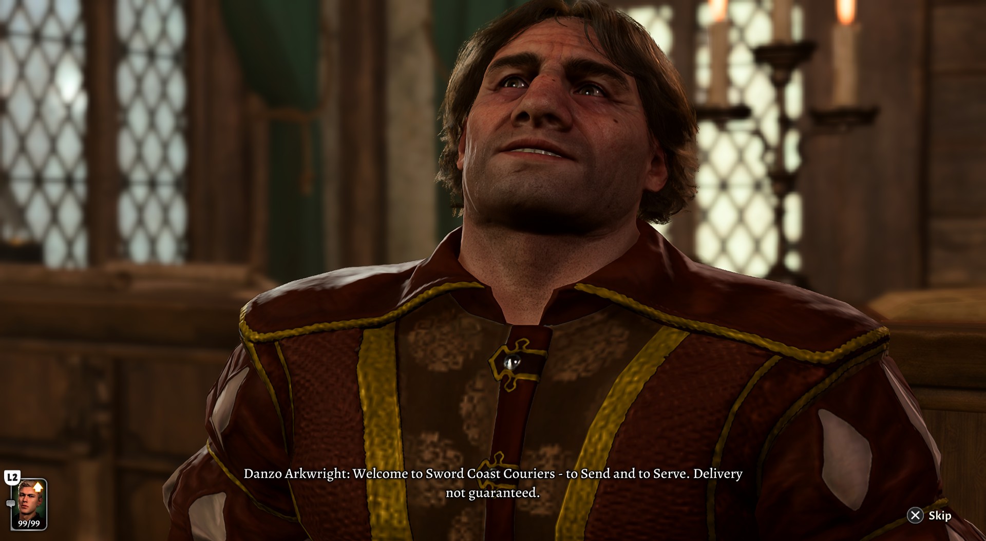 Speaking to Postmaster Danzo Arkwright at Sword Coast Couriers at X: 13 Y: 10 initiates a conversation about mail not being guaranteed.