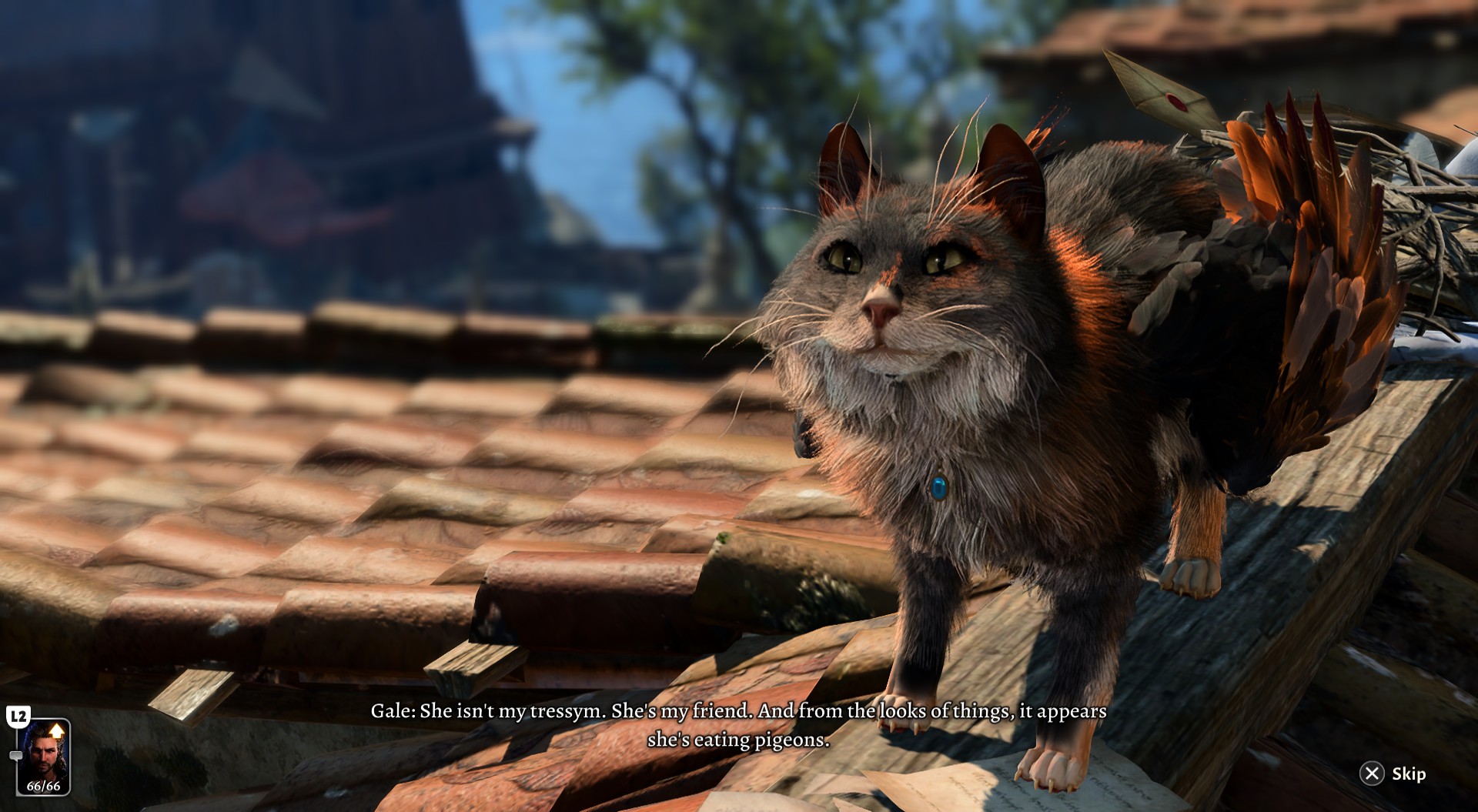 The party must go to the kitchen of the Open Hand Temple and exit out of the north door to the outside, then head east and around the building, where there are vines that allow roof access at X: -50 Y: 11. The culprit, a Tressym, is on the rooftop at X: -45 Y: -4 in a nest of pigeon remains and the pilfered letters. A successful perception check notes that this particular Tressym has Gale's collar on her, revealing her identity as his friend, Tara.
