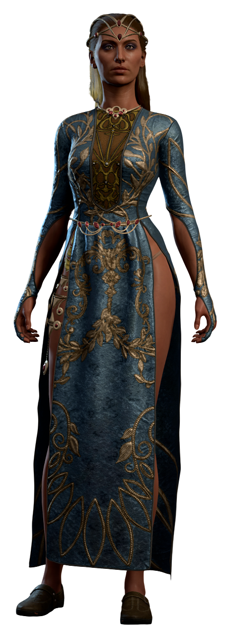 After the ceremony ends, Lady Freida moves to the northern nave of the Audience Hall and stands near the table with refreshments at its far end. She engages in a casual conversation with Lady Beatrice Provoss, discussing Gortash's low-born origins, information on the Cult of the Absolute available in patriars' libraries, and the need to call the City of for help. If spoken with, she toasts to Gortash and says that she sees the bright perspective of Baldur's Gate.