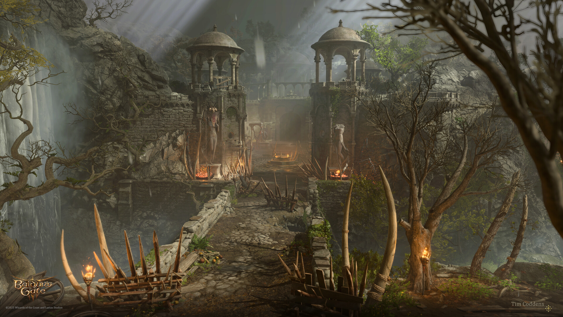 - Leaping off the cliff west of the windmill in the Blighted Village at X: -29 Y: 437, behind the broken statue of Selûne, then crossing the narrow stone bridge to reach the upper tier of the camp. Using Feather Fall is recommended.