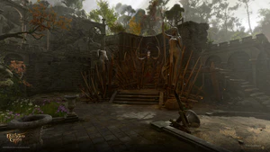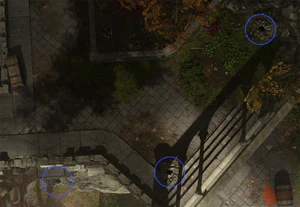Just above the main entrance is an open ground with a fountain. Several drunk goblins and bugbears sleep around it. They can wake up from any loud sound, including throwing an item or jumping close to them. If waked, they start an automated dialogue threatening the player character and must be placated by passing any skill check or by giving them a bottle of any wine. Waking them for the second time make them hostile, unless they were quelled with an illithid Wisdom skill check.