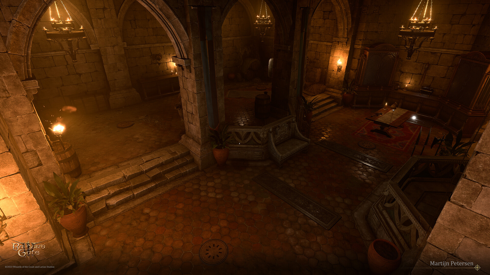 Behind the wall is the main part of the basement: a spacious hall with a study, a training ground, and multiple hunting trophies along the walls. The middle part of the hall is crossed with four Marble Plates which set off the vents emanating Cloudkill vapors. Each marble plate requires DC 15 Perception Check to find and DC 15 Sleight of Hand Check to disarm. Also, a button on the wall at X: -2342 Y: 834 disables all traps.