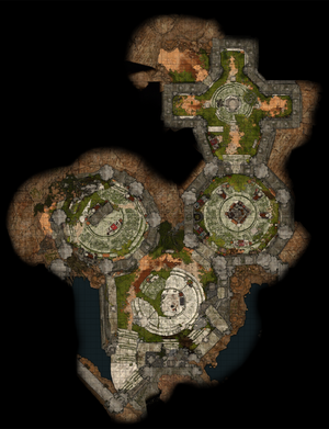 The Inner Sanctum of the Emerald Grove comprises a series of vast circular caverns divided by either movable stone doors or simple archways.