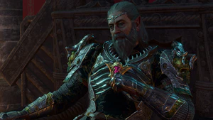 After entering Moonrise Towers, the party is urged to go to the audience chamber. Upon entering it, Ketheric sits on a throne while one of his minions, Disciple Z'rell, can be seen interrogating a group of characters about what happened at the Goblin Camp during Act One. Depending on several things the party did during Act One, some variations are possible.