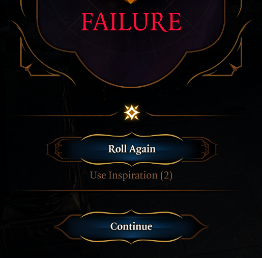 Inspiration is a game mechanic in Baldur's Gate 3. Inspiration points can be spent to re-roll certain failed d20 rolls, and are earned by making choices which fit the player characters' backgrounds; they are shared between all characters.
