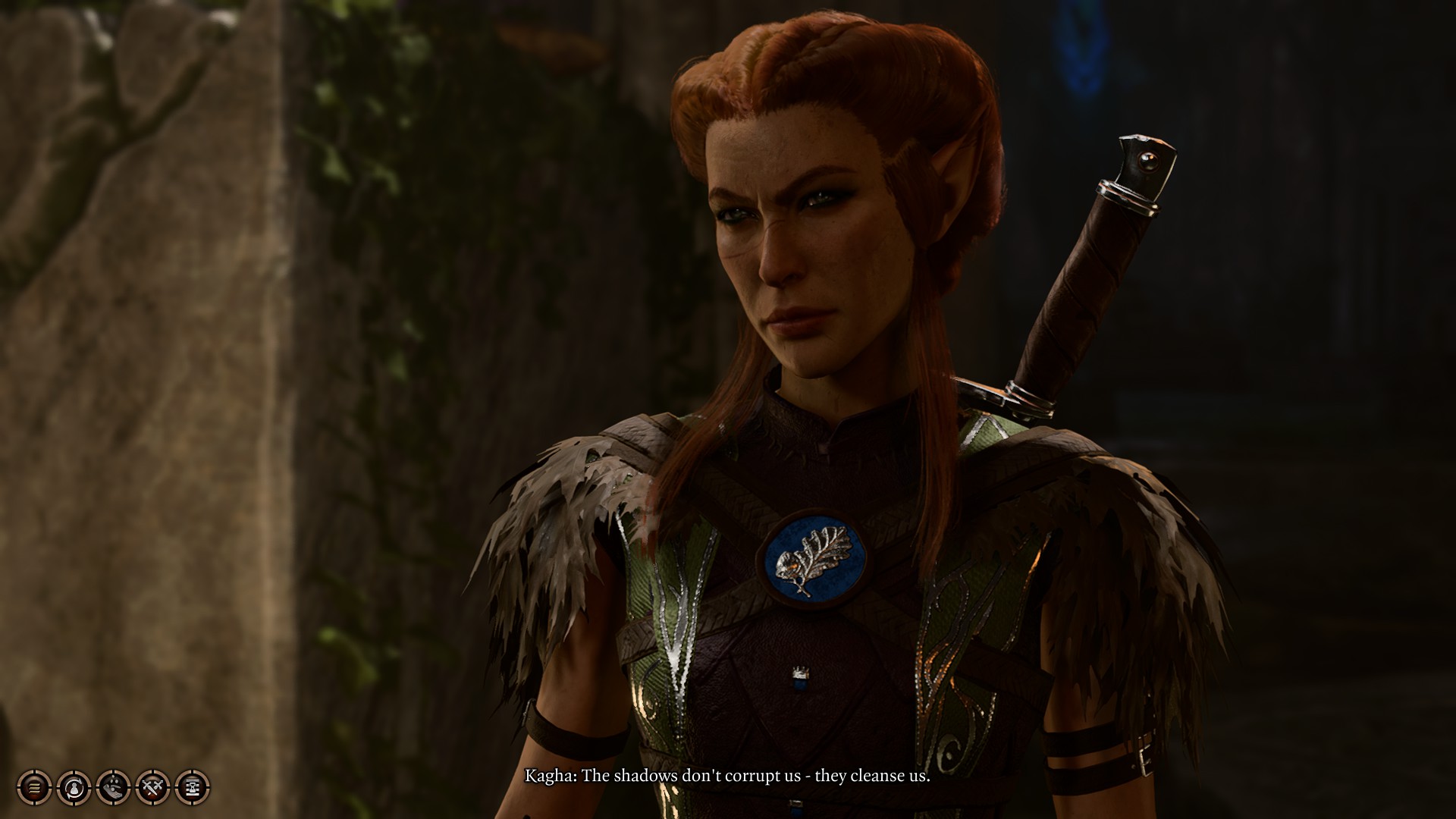 If the party complete Investigate Kagha and find evidence of her collaborating with the Shadow Druids, then Kagha can be confronted without the druids becoming hostile. The party has a chance to sway Kagha to their side, otherwise the party can simply state that she is too far gone and fight her to the death with the other Shadow Druids. If she is slain, Loic and Marcoryl join her. Either choice results in the Rite of Thorns being stopped, and the tieflings are allowed to safely leave the Grove when they are ready.