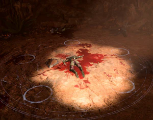 In the southern wall of the basement is a sizeable breach which opens into a large roundish cave with a ritual circle in the centre. There lies the body of Incontinentia Figgin[2], which can be looted for Clown's Severed Leg and the note titled Sendai, the Third. These items are the part of the quest Find Dribbles the Clown. If already started, picking up these items progress it. Otherwise, party members simply comment on the scene and the gory loot. Along the cave walls the bodies of six more dead drow women, all with the same appearance and portraits as Incontinentia.