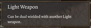 Light is a weapon attribute that allows characters to dual wield weapons (that is, wield two Light weapons, one in the Main Hand and one in the Off-hand).