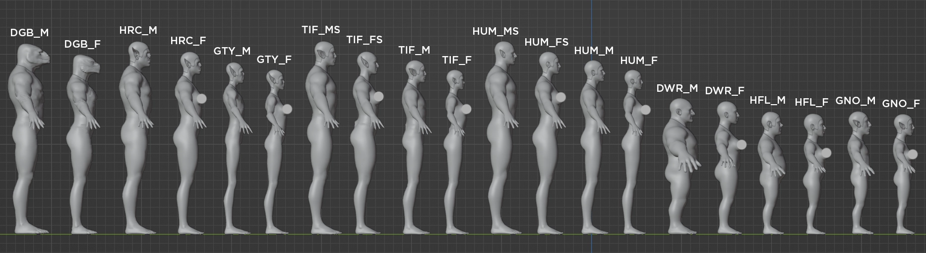 *Note that while Elves/Drow share a body with Humans, their textures are different (lack of bodyhair for example) - so searching for ELF_M_NKD_Body_A will net you the correct entry that technically uses the HUM_M_NKD_Body_A meshes but assigns different materials to them.