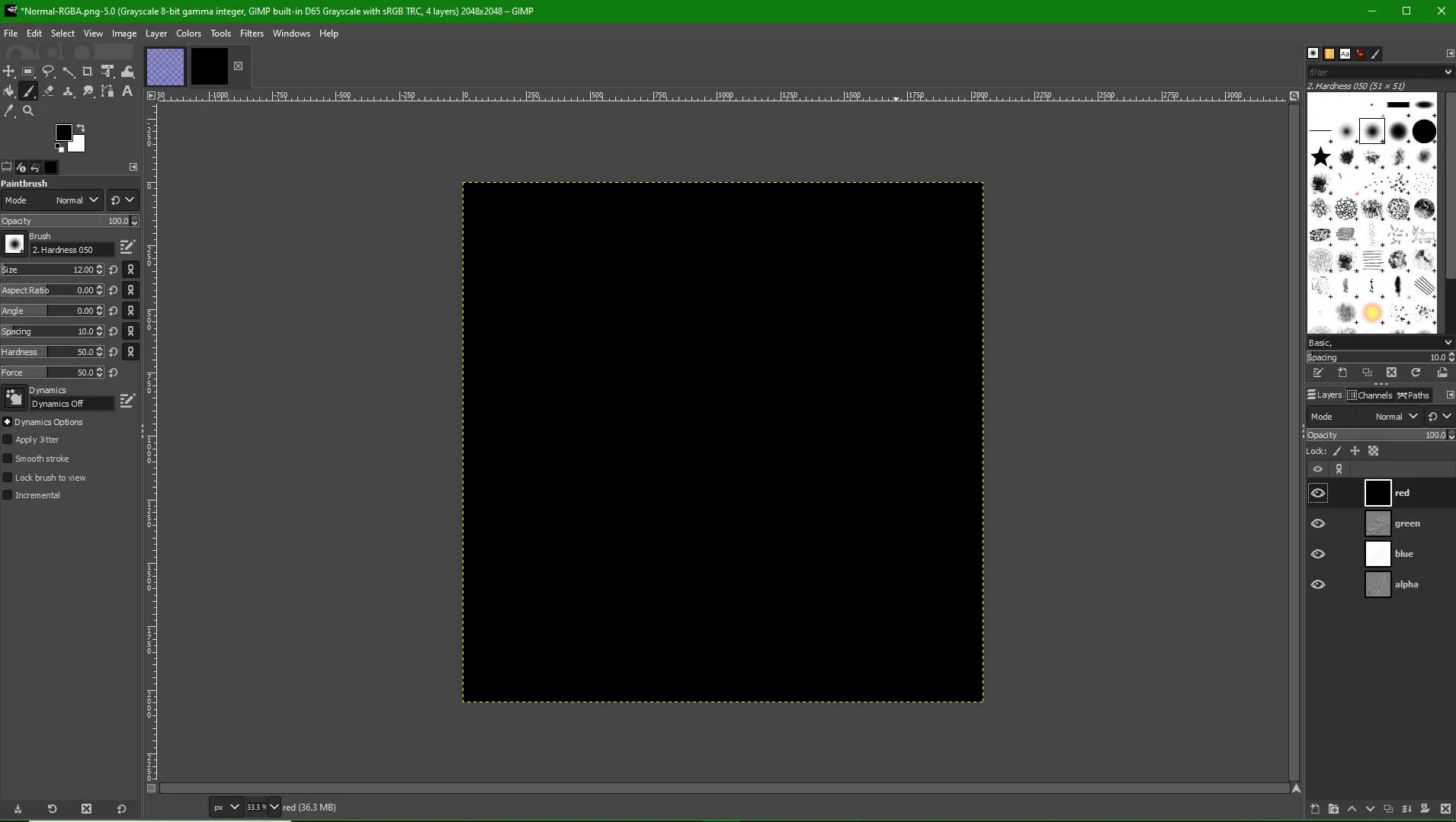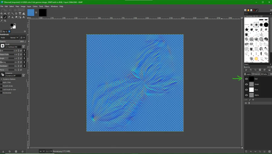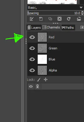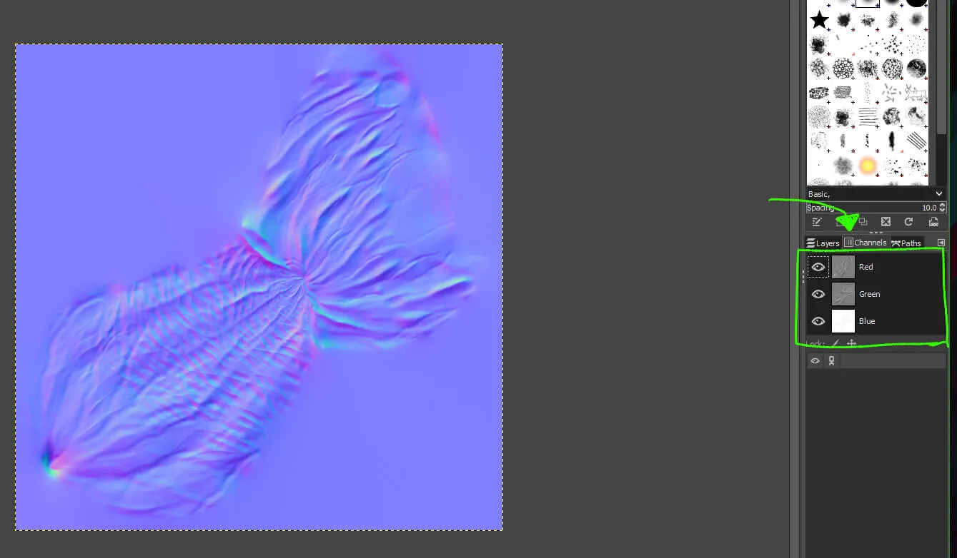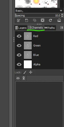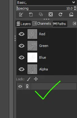 1. Open your Normal Map in GIMP, and click on the Channels tab to view the channels of your map. Depending on the program you created your normal map with, you might or might not have an Alpha channel already.
