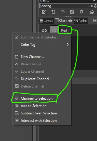 3. Back in your Channels tab, right-click on the "Red" channel and select "Channel to Selection".
