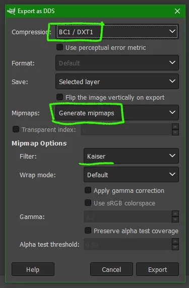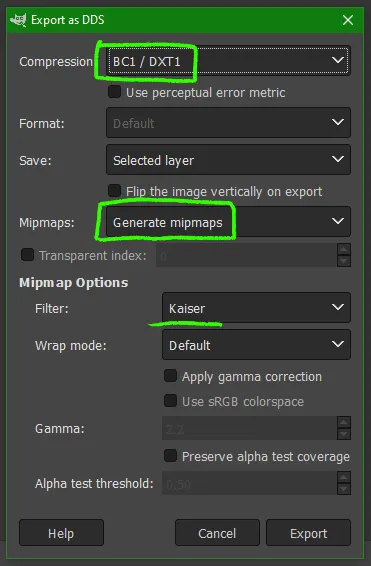 4. To correctly export your Basecolor map as a .dds file, make sure to select "BC1/DTX1" for Compression, and "Generate mipmaps" for Mipmaps. Set the Filter under Mipmap Options to "Kaiser".