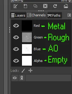 20. Your channel order for the finished PM should be Metalness in Red, Roughness in Green, AO in Blue, and nothing in Alpha.
