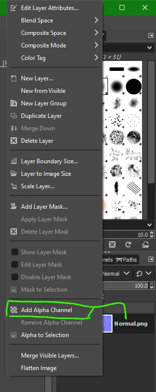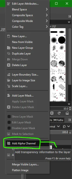 3. Right-click on your layer and select "Add Alpha Channel". This will add a blank Alpha channel.