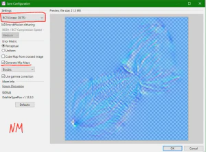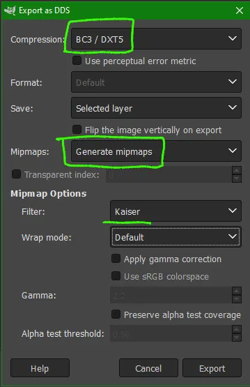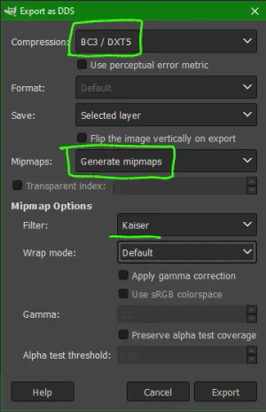 17. To correctly export your Normal map as a .dds file, make sure to select "BC3/DTX5" for Compression, and "Generate mipmaps" for Mipmaps. Set the Filter under Mipmap Options to "Kaiser".