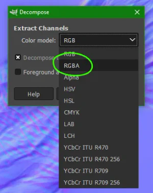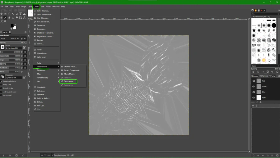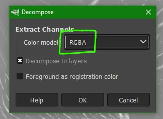 7. In the menu bar, go to "Colors -> Components -> Decompose". This is going to create and open a new version of your file, with all the channels separated into individual layers.