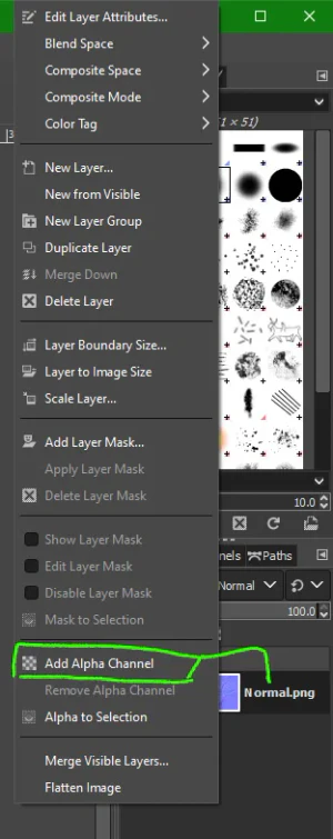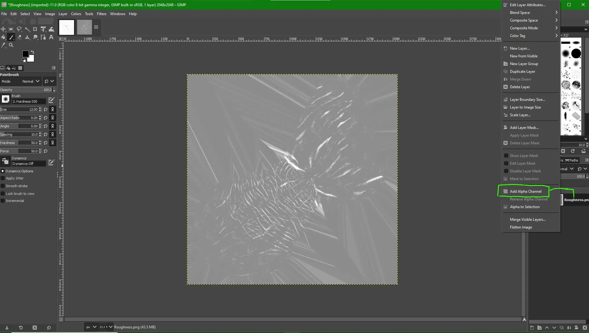 1. Open your Basecolor Map in GIMP. Right-click on the layer and select "Add Alpha Channel". This will add an empty Alpha channel.