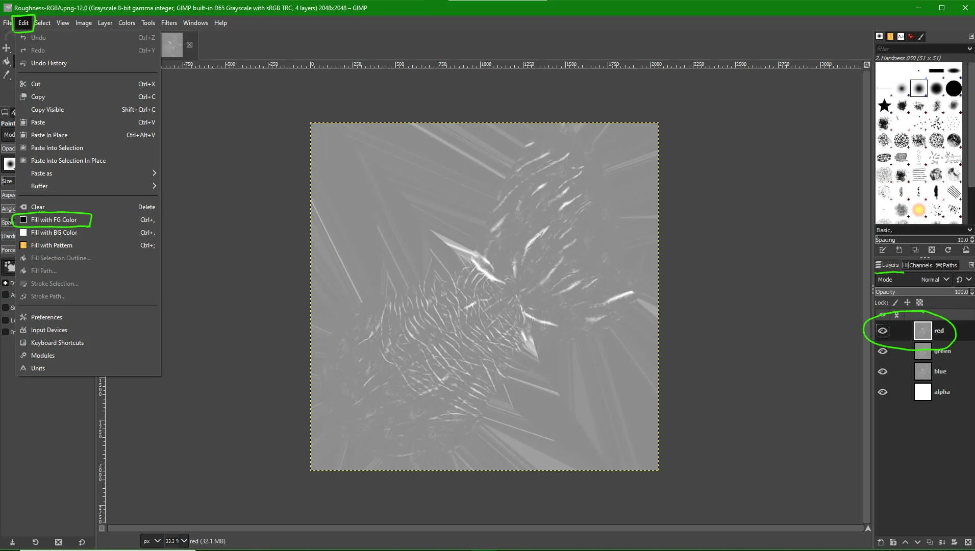 7. If your Metalness map was just black, you can simply fill the "red" layer with black. If your Metalness map has information in it, follow the steps for the AO map instead to insert the Metalness map into the "red" layer.