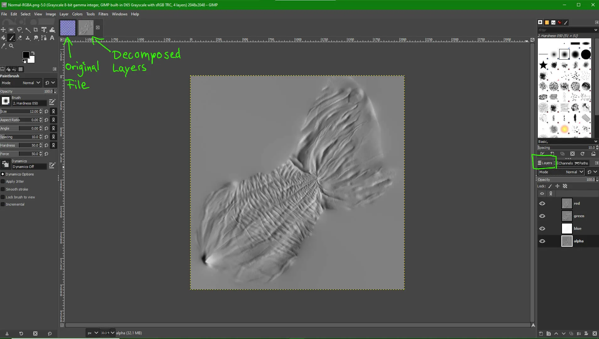 9. You should now see a file that looks like your normal map, but in greyscale. In the layers tab you will see that each channel has its own layer now.