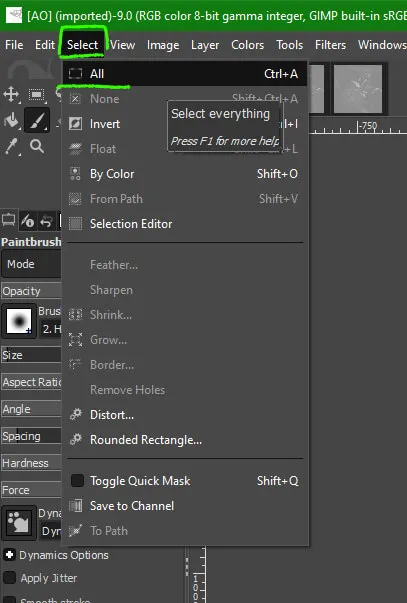 9. Now swap over to your AO map file and in the menu bar go to "Select -> Select All" to select the entire image.