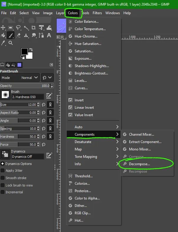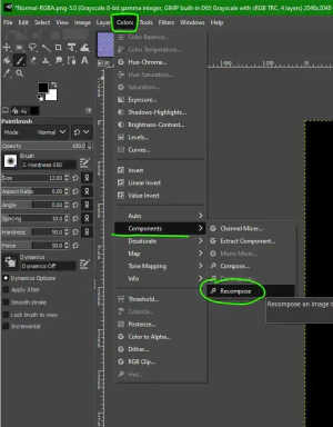 17. Go to "Colors -> Components -> Recompose" in the menu bar to recompose the layers back into channels in your original file.